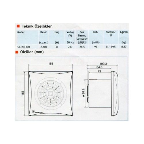 BU ÜRÜN DOĞRUDAN CAMA MONTAJ İÇİN UYGUN DEĞİLDİR. AYRICA SATIN ALABİLECEĞİNİZ MONTAJ KİTİNİ KULLANARAK CAMA MONTE EDİLEBİLİRSİNİZ. GENEL ÖZELLİKLER: Silent serisi plastik enjeksiyon ile üretilmiştir. Serideki tüm fanlar bilyalı rulmana sahiptir. Maksimum çalışma sıcaklığı 40°C’dir. IP45 korumalı Silent serisi su sıçramalarından etkilenmez. Geri tepme ventili kanaldan gelebilecek kirli havanın içeri girmesine izin vermez. Silent 100 modelleri 8W, Silent 200 modelleri 16W, Silent 300 modelleri ise 29W güç tüketir. TEKNİK ÖZELLİKLER: Pilot ışığı: Var Geri akış panjuru: Var Zamanlayıcı: Yok Nem sensörü: Yok Bilyalı rulman:Var Devir (rpm): 2400 Serbest atıştaki emilen güç (W): 8 Voltaj (V) 50 Hz: 230 Ses basınç seviyesi (dB(A)): 26,5 Serbest atıştaki hava debisi (m³/h): 95 Yalıtım / IP: Class II / IP45 Ø Kanal (mm): 100 Ağırlık (kg): 0,57 Maksimum çalışma sıcaklığı: 40°C