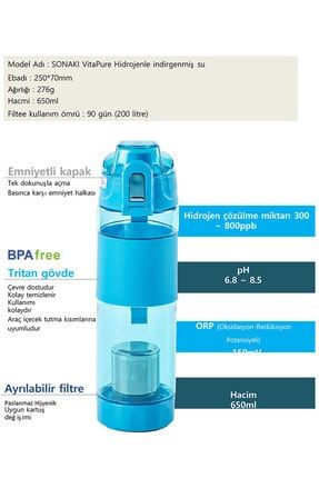 Vitapure plastik hidrojenli su matarası, markanın yenilikçi teknolojiye sahip tesislerinde özel olarak üretilir. Her bir özelliği, kullanıcı memnuniyetini üst seviyelerde tutacak şekilde tasarlanır. Dış ortamlardan gelebilecek darbelere karşı koruma sağlar. Vitapure hidrojenli 650 ml beyaz su matarası, tritan gövdeye sahiptir. BPA ve çevresel hormon içermez. Koku yapmayan özel gövde, insan sağlığı için fayda sağlar. Kapağı ve filtreyi çıkararak matarayı kolayca temizleyebilirsiniz. Ayrılabilen filtre, paslanmaz çelikten üretilir. Vitapure hidrojenli 650 ml beyaz su matarası, işlevselliğinin yanı sıra ergonomik kullanım imkânına da sahiptir. Özel olarak geliştirilen gövde tasarımı, araçlardaki bardak tutma yerlerine uygundur. Bu sayede ürünü evde, seyahatte, sporda ya da araçta güvenle kullanabilirsiniz. Vücudun su ihtiyacını her yerde karşılayabilir, pek çok hastalıktan korunabilirsiniz.